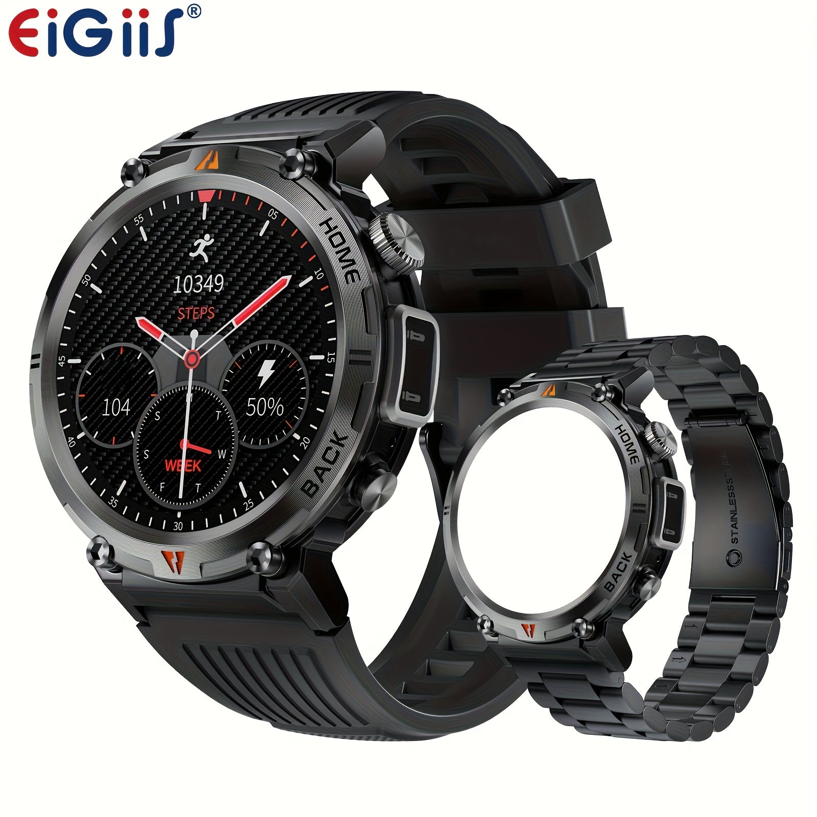 Contents of the package include: 1 EIGIIS Smart Watch, 1 Charging Cable, and 1 User Manual.